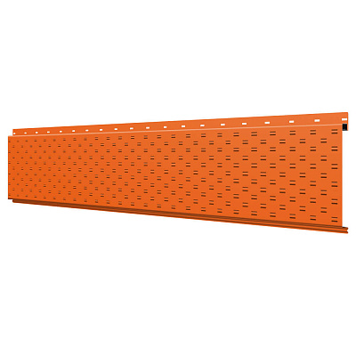 Линеарная потолочно-стеновая панель с ПЕРФОРАЦИЕЙ для вентиляции цвет RAL2004 Оранжевый Апельсин применяется в качестве софитов для подшивы крыши, наружной и внутренней отделки потолков, стен, фронтонов фасада дома в Челябинске.