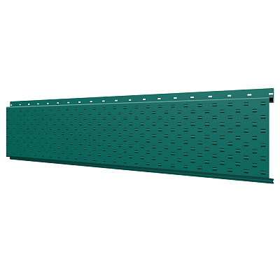 Линеарная потолочно-стеновая панель с ПЕРФОРАЦИЕЙ для вентиляции цвет RAL6026 Опал применяется в качестве софитов для подшивы крыши, наружной и внутренней отделки потолков, стен, фронтонов фасада дома в Челябинске.