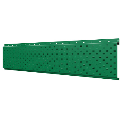 Линеарная потолочно-стеновая панель с ПЕРФОРАЦИЕЙ для вентиляции цвет RAL6029 Зеленая Мята применяется в качестве софитов для подшивы крыши, наружной и внутренней отделки потолков, стен, фронтонов фасада дома в Челябинске.
