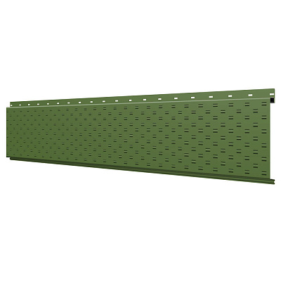 Линеарная потолочно-стеновая панель с ПЕРФОРАЦИЕЙ для вентиляции цвет RAL6002 Зеленый Лист применяется в качестве софитов для подшивы крыши, наружной и внутренней отделки потолков, стен, фронтонов фасада дома в Челябинске.