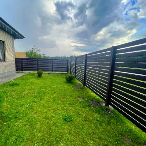 Комбинированный забор «жалюзи-ранчо», выполненный с использованием ламелей Еврожалюзи и Металлопланкена в цвете RAL 8019 Тёмный Шоколад с покрытием полиэстер. Такое решение объединяет современный дизайн и практичность: горизонтальные планки создают эффект лёгкости и геометрической строгости, а тёмный оттенок придаёт ограждению солидный и стильный вид. Благодаря использованию качественных материалов забор устойчив к погодным условиям и надолго сохраняет свою привлекательность, гармонично сочетаясь как с архитектурой дома, так и с окружающим ландшафтом.